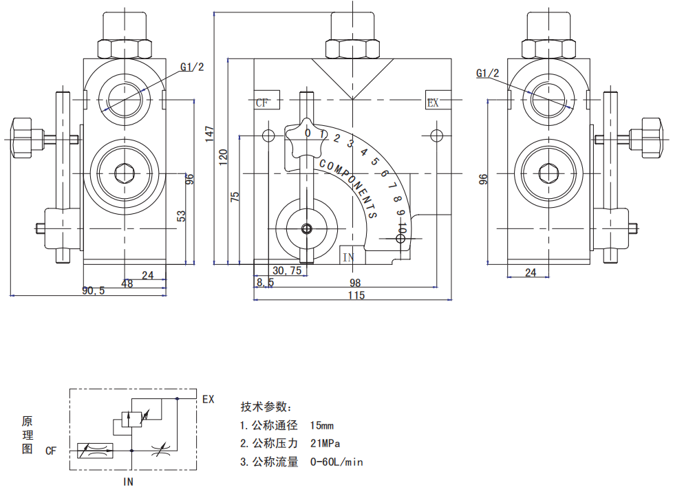LKF全范圍壓力補(bǔ)償可變流量控制閥。經(jīng)過(guò)精心設(shè)計(jì),它的節(jié)流口面積會(huì)隨著閥桿的旋轉(zhuǎn)而變化。不論CF油口EX油口的壓力如何變化,控制油口的流量始終是平穩(wěn)恒定的。它擁有一個(gè)可調(diào)節(jié)的彈簧安全閥使壓力可以上升到設(shè)置的安全壓力。安全閥的壓力出廠設(shè)置是1500psi可調(diào)節(jié)范圍是750-3000psi。